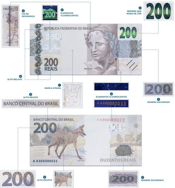 Saiba como identificar uma cédula de 200 reais. Veja também. SAIBA MAIS NÃO FIQUE COM DÚVIDA.. Como esta cédula de R$200 também faz parte da Segunda Família do Real, foi mantido o mesmo tema, ou seja, a efígie da República no anverso e um animal da fauna brasileira no reverso (lobo-guará).. comparar a nota com outras de mesmo.