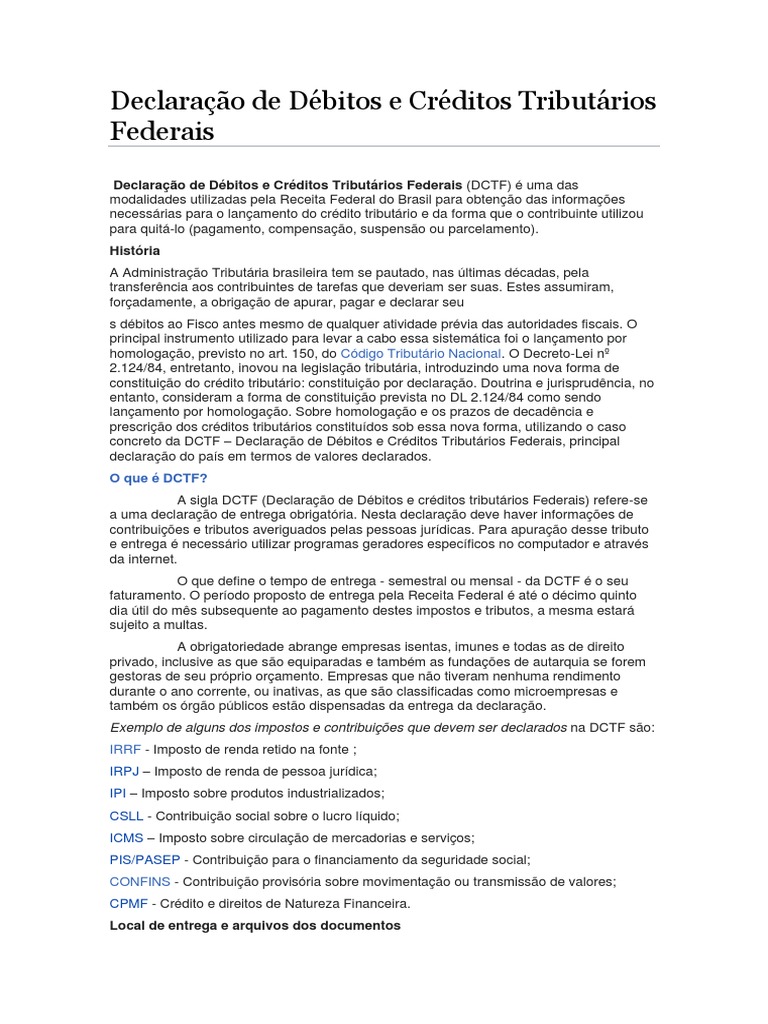 A sigla DCTF (Declaração de Débitos e créditos tributários Federais) refere-se a uma declaração de entrega obrigatória. Nesta declaração deve haver informações de contribuições e tributos averiguados pelas pessoas jurídicas. Para apuração desse tributo e entrega é necessário utilizar programas geradores específicos no.
