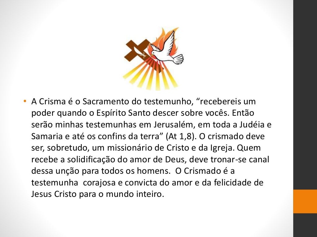 Chama-se Confirmação, porque confirma e reforça a graça batismal. O óleo do Crisma é composto de óleo de oliveira (azeite) perfumado com resina balsâmica. Na manhã da Quinta-feira Santa, o bispo o consagra para ser utilizado no batismo, na confirmação, na ordenação dos sacerdotes e dos bispos e na consagração dos altares e dos.