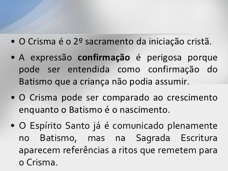Conheça alguns fatos cruciais que todos os que se preparam para a Crisma devem saber. 1. A Crisma é a finalização do Batismo. O Batismo marcou o início de seu relacionamento com Cristo. Sua alma mudou permanentemente e você recebeu a graça de Deus. Por meio da Crisma, o Espírito Santo fortalece essas graças, dá a você mais graças e.