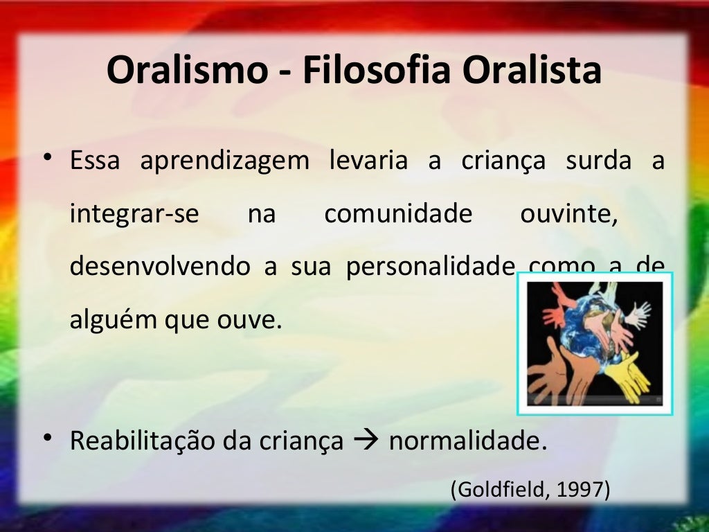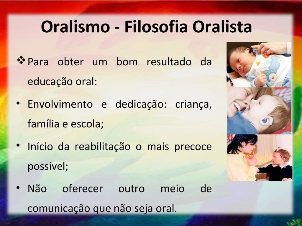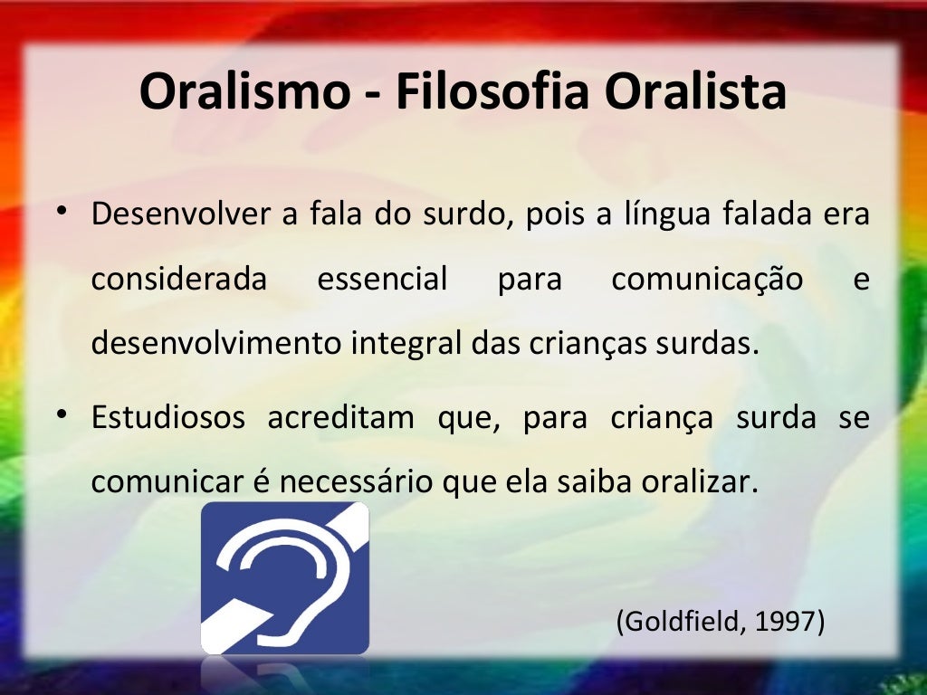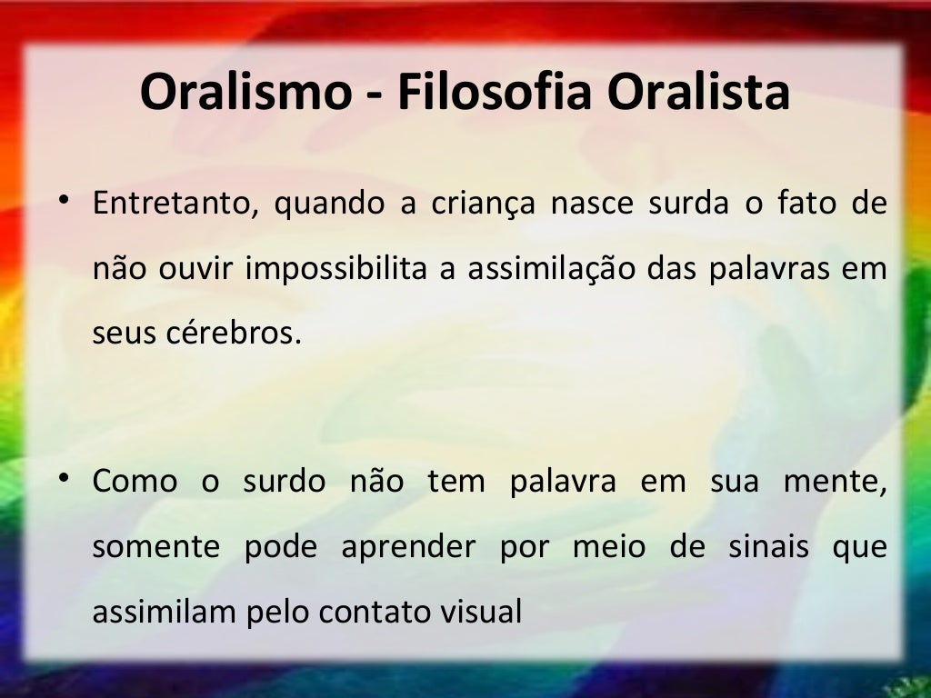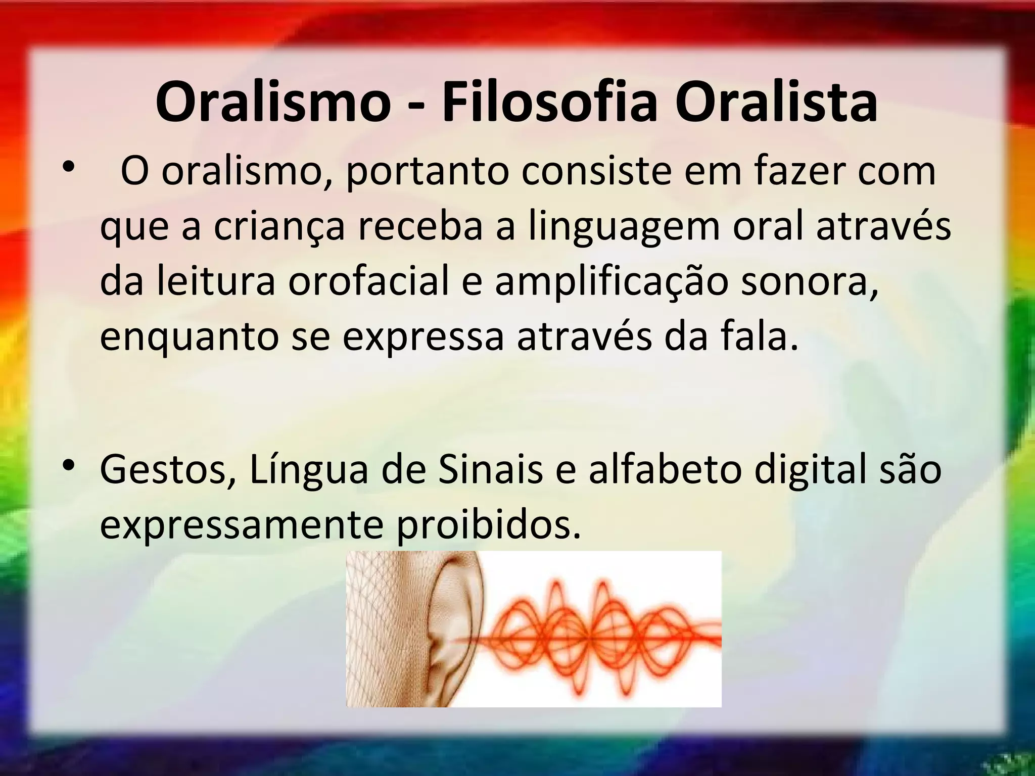 Oralismo: o que é por que é importante? Surgiu por volta do século XVIII e a partir das resoluções do Congresso de Milão (1880). Na época a língua de sinais foi oficialmente proibida nas escolas e a comunidade surda foi excluída da política e instituições de ensino. Essa proposta pretendia que os surdos fossem reabilitados, ou.