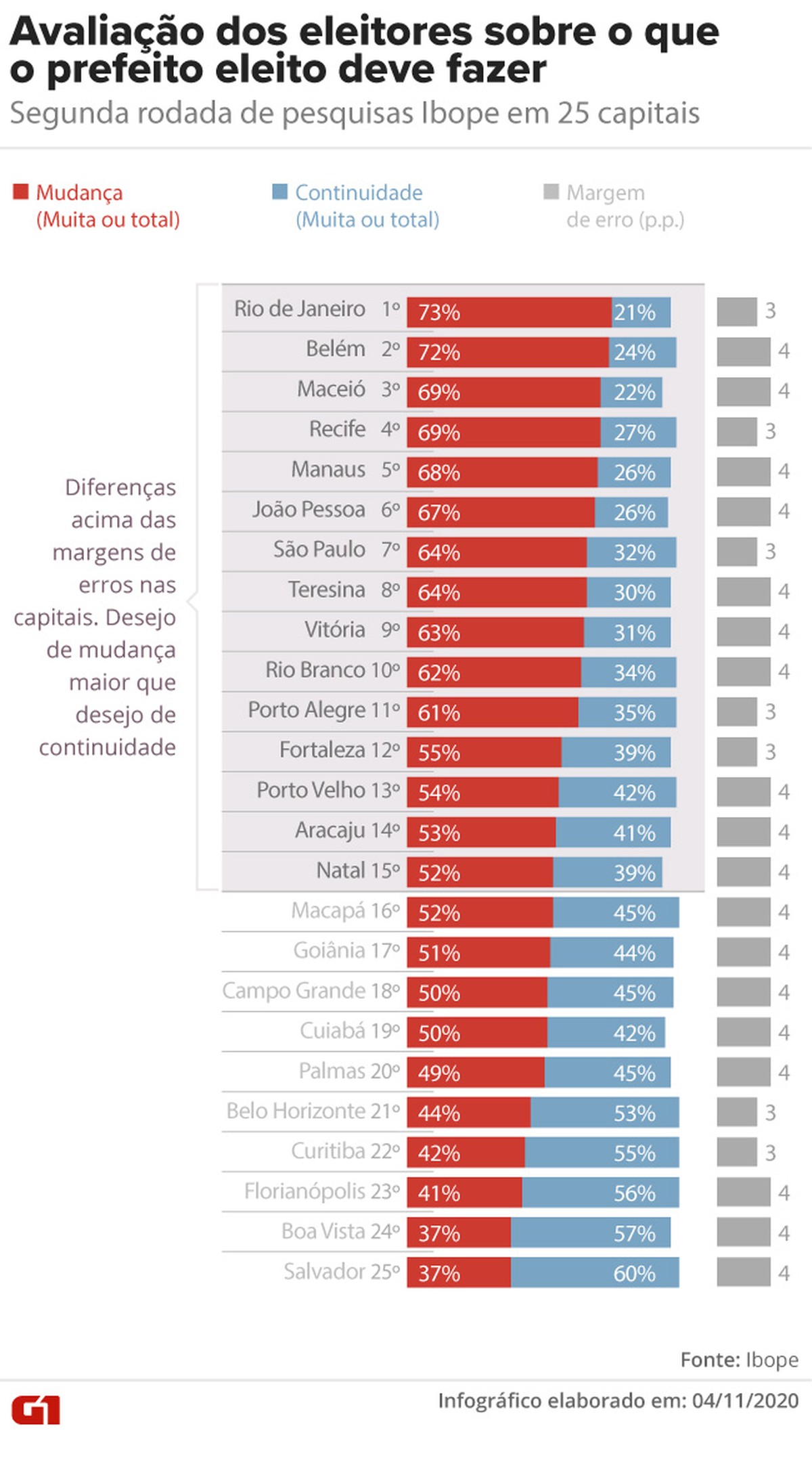 Em 15 de 25 capitais, eleitores desejam mais mudança que continuidade na administração do