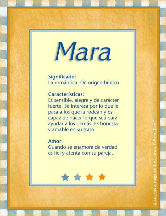 A origem do nome Mara vem do Hebraico com significado de amarga, amargosa. Ainda este nome diz respeito à justiça e se orienta e procura fazer sempre pelo que é verdadeiro. Este é um nome tomado por Naomi no Antigo Testamento (ver Rute 1,20): Mas ela respondeu-lhes: "Não me chameis de Noemi; chamai-me de Mara, pois Shaddai me encheu de.