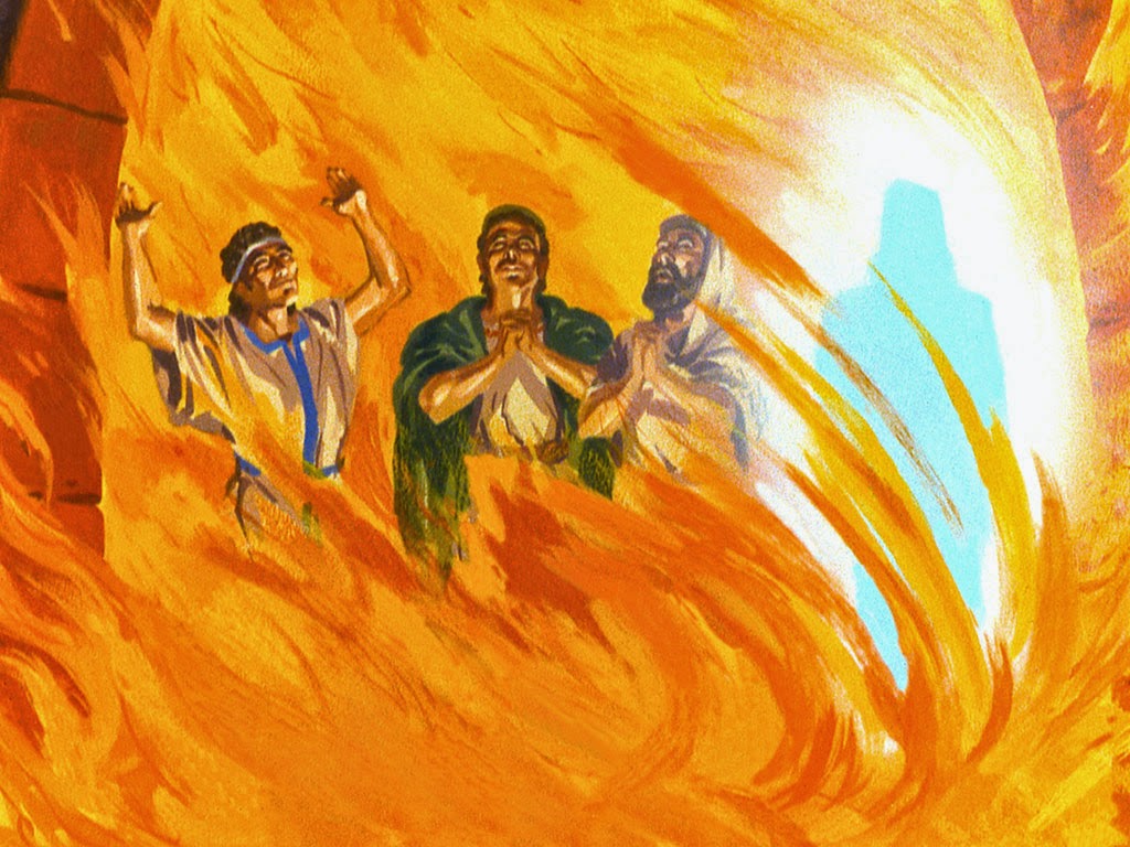 Sadraque, Mesaque e Abede-Nego conversando com o rei. Sadraque, Mesaque e Abede-Nego obedeceram aos mandamentos de Deus mesmo quando a vida deles estava em perigo. O exemplo que deram ajudou o rei a acreditar em Deus. Daniel 3:28-29. Sadraque, Mesaque e Abede-Nego não adoraram a estátua do rei. O rei ficou furioso e os lançou no fogo.